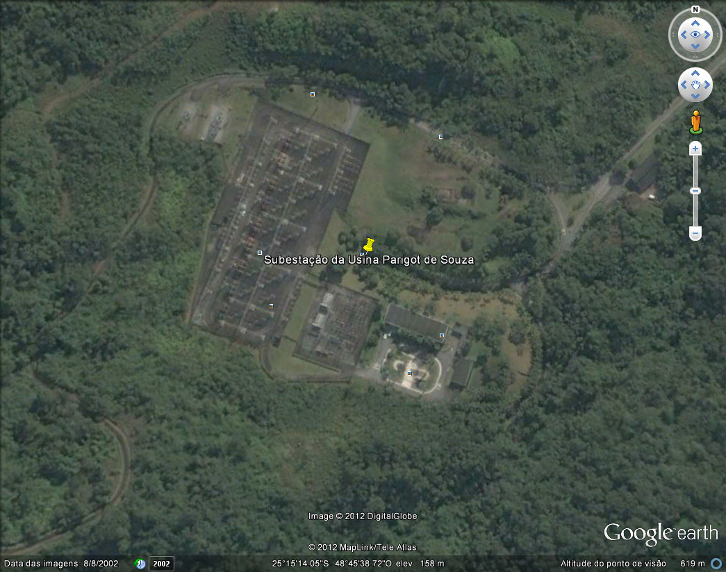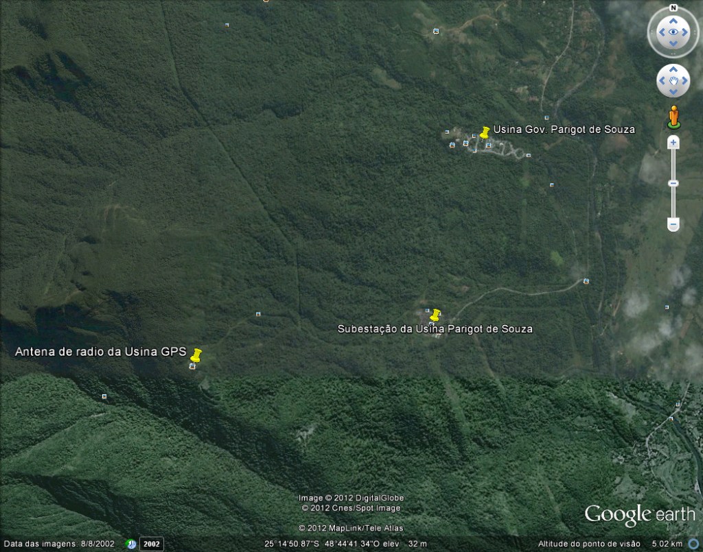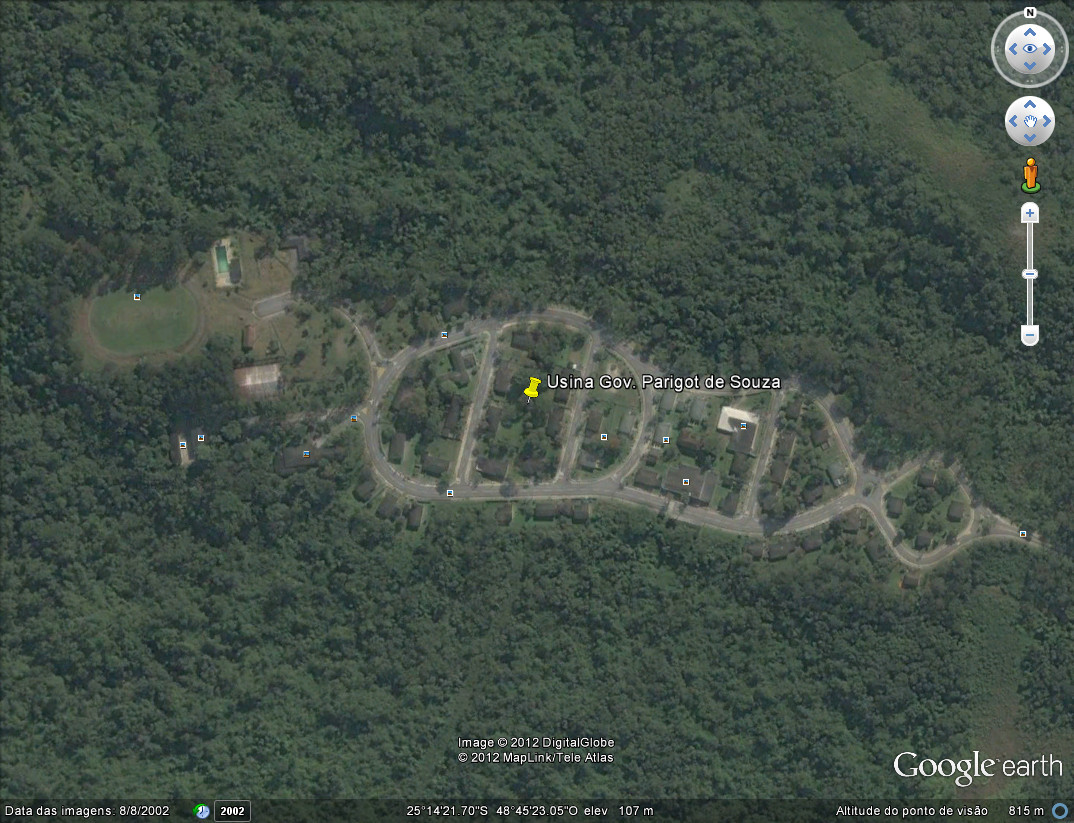 Novas informações a respeito da pirâmide no litoral paranaense. Seguindo a dica de um visitante do blog, fui pesquisar no Google Earth algumas imagens a cerca da Usina Gov. Parigot de Souza, construída nas proximidades da suposta pirâmide. A central da Usina encontra-se a aproximadamente 24 km da pirâmide, juntamente com uma subestação e uma antena de rádio.