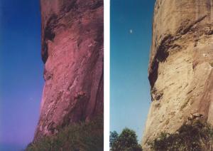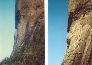 Mas quando se olha a face desde a Pedra Bonita e se esquadrinha com atenção e um bom binóculo, surgem muitas dúvidas. Porque de frente não se tem a noção de profundidade dos traços que se vem de perfil. E o nariz que visto de bem embaixo, no caminho da Carrasqueira parece comprido e razoavelmente elegante. Visto de frente, parece um nariz excessivamente largo, o que deforma a avaliação das proporções da face. Os olhos não chamam a atenção, o que se vê é um olho maior, com um buraco a mais dentro dele sem significar nada de especial e o outro formado por dois buracos que não tem muita forma. E se começa a pensar que aquilo não é nada, a não ser acidente da natureza.