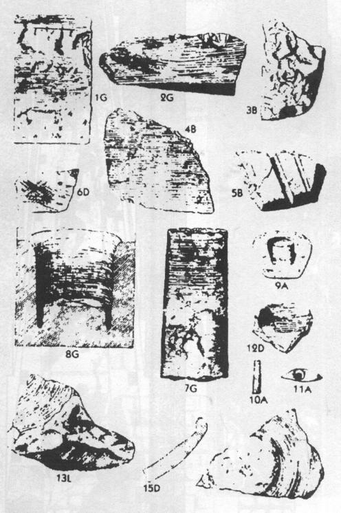 Analisando a forma dos cortes feitos nos itens de basalto 3b e 5b, é possível imaginar que foi utilizada uma serra de fio, que deixou sua marca na pedra. O raio pleno na base do corte tem exatamente a forma que seria deixada por uma dessas serras.