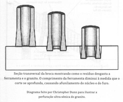 Desde a publicação do artigo, visitei o Egito duas vezes, e após cada visita voltei respeitando mais e mais os antigos construtores de pirâmides. Em minha visita de 1986, fui ao Museu do Cairo e dei uma cópia de meu artigo, juntamente com meu cartão de visitas, ao diretor do museu. Ele me agradeceu gentilmente, jogou o artigo em uma gaveta juntando-o a outros mate riais variados e saiu da sala. Outro egiptólogo levou-me à “sala de ferramentas” para instruir-me sobre os métodos dos antigos pedreiros e mostrar-me algumas caixas com primitivas ferramentas de cobre. Perguntei ao meu anfitrião o que ele sabia sobre o corte de granito, pois era esse o foco de meu artigo. Ele explicou que os antigos egípcios faziam uma ranhura no granito, inseriam nela cunhas de madeira e depois ensopavam a madeira com água. A madeira inchava e criava pressão sobre a fenda, partindo a pedra. Partir uma pedra é bem diferente de usiná-la, e ele não soube explicar como implementos de cobre podiam cortar granito, mas estava tão empolgado com sua própria explicação que não o interrompi. Para provar seu argumento, ele foi comigo até uma agência de turismo próxima do museu e me incentivou a comprar uma passagem aérea até Assuã, onde, segundo disse, a evidência era clara. Eu devia ver as marcas da extração lá, insistiu, bem como o obelisco inacabado.
