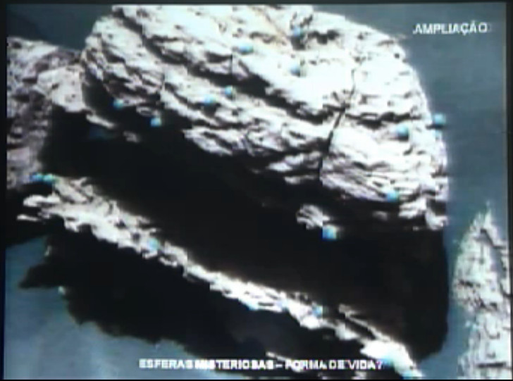 Esferas perfeitas sobre uma rocha. Seriam naturais, ou artificiais? As esferas estão realçadas em azul para facilitar a visualização.