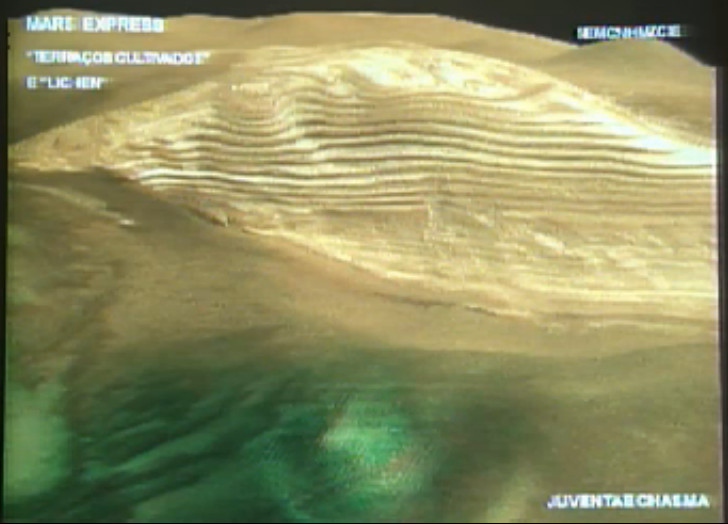 Encostas de montanhas escalonadas. Segundo a NASA são formações naturais feitas pelo vento.