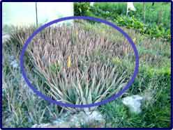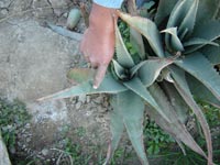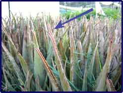 Esta planta que mostra a ponta extremamente queimada estava nessa área demarcada pelo círculo azul na imagem anterior. O testemunho dos agricultores que cuidam desse terreno é que todos os anos, grande parte das pontas se queimava a partir de determinado ponto assinalado pelo dedo na imagem abaixo.