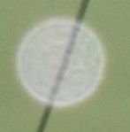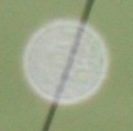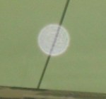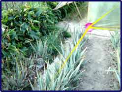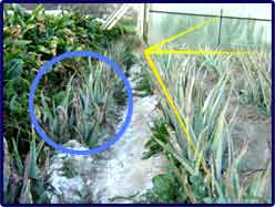 Nesta área, o resultado positivo contra a geada foi comprovado mais uma vez. Podemos observar duas fileiras de plantas em que uma está dentro da pirâmide a outra não. A fileira da esquerda, assinalada dentro do círculo azul, está fora da pirâmide e as pontas foram queimadas. A fileira da direita está parcialmente dentro da pirâmide, mas as pontas não estão queimadas e ainda menos o resto da plantação.
