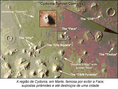 A banda The Gak Omek parece ser a única entidade no planeta, além de mim, que “percebeu” alguma conexão. Em seu disco, Return of the All-Powerful Light Beings, deu às músicas nomes derivados da conspiração. Uma delas era Dance of the Nine Unknown Men (sim, “Dança dos Nove Homens Desconhecidos”, mas a melodia é fantástica) e outra Cidonya, a região de Marte mostrada acima.