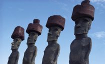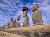 Da borda da cratera, pude ver a maior e mais próxima plataforma (chamada Ahu Tongariki), cujas 15 estátuas tombadas foram reerguidas em 1994 através de um guindaste capaz de erguer até 55 toneladas, como me contou o arqueólogo Claudio Cristino, responsável pelo trabalho. Mesmo com esse moderno equipamento, a tarefa mostrou-se desafiadora para Claudio, porque a maior estátua do Ahu Tongariki pesava 88 toneladas. Contudo, a população polinésia da ilha de Páscoa pré-histórica não possuía guindastes, rodas, máquinas, instrumentos de metal, nenhum animal de tração e nenhum meio além da força humana para transportar e erguer as estátuas.