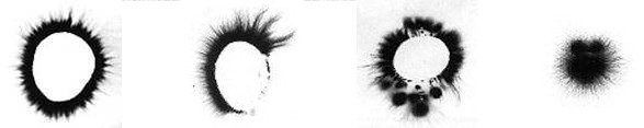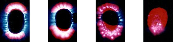 As quatro Fotografias Kirlian coloridas seguintes, bem como as em preto e branco, representam, na sua seqüência, os quatro fenômenos básicos: (1) emissão normal, (2) deficiência, (3) agressão e (4) degeneração.