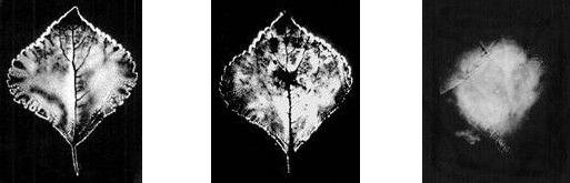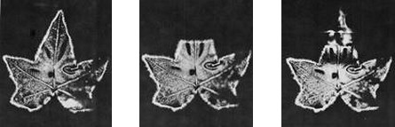 A primeira fotografia foi feita com a folha recém colhida. Na segunda, a folha foi amputada e, como se pode observar, não se vê nenhum fantasma. Na terceira, a folha foi amputada, e depois colocada uma régua de fibra-de-vidro opaca, à frente da parte amputada. A folha inteira nunca tinha estado em contacto com o filme fotográfico, daí se exclui a hipótese de ela ter deixado alguns traços de umidade.