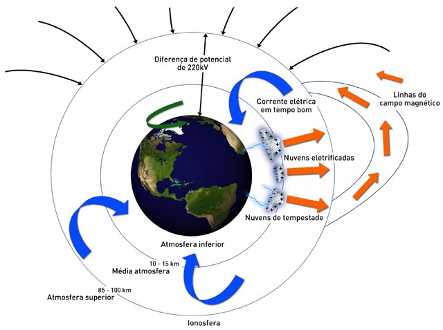 O campo elétrico terrestre movimenta estes íons. Os íons positivos deslocam-se no sentido do campo a atingem a superfície terrestre, na razão aproximadamente de 1.800 C por segundo. A carga da Terra, sendo negativa a avaliada em 580 000 C, com a chegada desses 1.800 C/s (1800 A), se neutralizaria em poucos minutos. Mas existe uma outra fonte de cargas negativas que atingem a Terra, mantendo sua carga negativa: são os temporais violentos com seus raios.