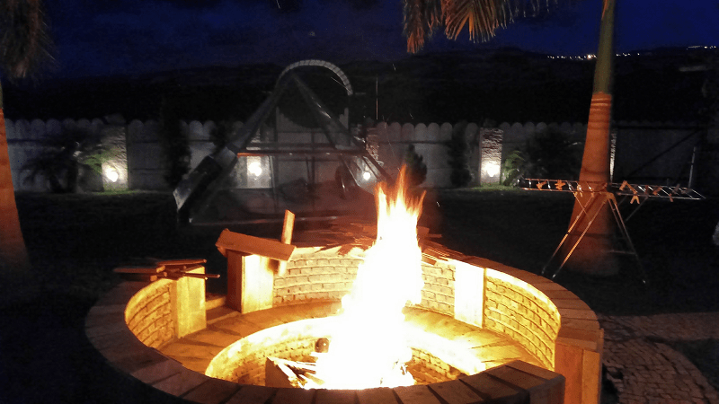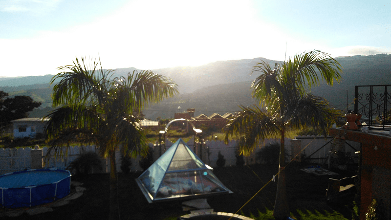 Tem 1,9m de altura por 3,0m de base. É feita com estrutura de metal e cobertura de vidro. Foi instalada sobre um fosso onde está uma caixa d’água também com 1,9m de altura. Rodeada por palmeiras e muita grama verde a vista é espetacular!