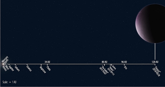 É o primeiro objeto do Sistema Solar detectado a uma distância maior do que 100 vezes a distância entre a Terra e o Sol – essa distância é conhecida como unidade astronômica (ua).
