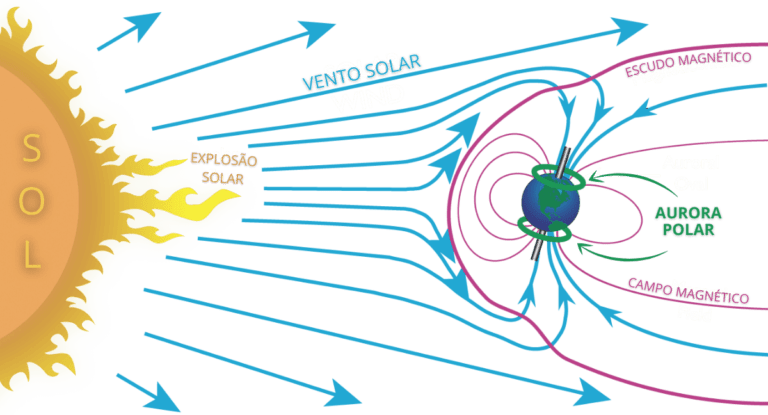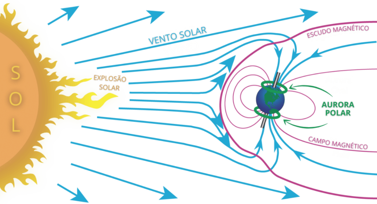 A Aurora Polar é uma reação luminosa causada pelo impacto do vento e poeira solar com a atmosfera terrestre. Esse fenômeno só acontece nas regiões polares – próximo do Polo Sul e do Polo Norte – por causa da canalização pelo campo magnético terrestre.