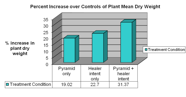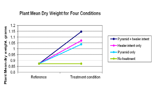 As condições físicas das amostras de plantas foram controladas, incluindo o nível de luz ambiente, temperatura e rega. Fotografias das plantas foram tiradas ao longo do tempo e comparadas quanto ao tempo de germinação, crescimento e tamanho das folhas. Não foram encontradas diferenças aparentes na germinação para os 4 grupos. As plantas sob a pirâmide tinham folhas maiores, aproximadamente 5 cm de comprimento, em comparação com os controles, de 3,5 cm de comprimento. As plantas tratadas com intenção mais pirâmide mostraram caules mais longos que se entrelaçavam em comparação com os controles, que eram mais curtos e não se entrelaçavam.