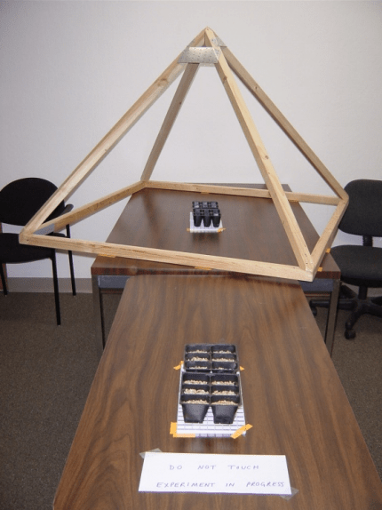 A estrutura piramidal com base quadrada de 4 pés, composta por bordas de madeira de 2 x 2 polegadas com triângulos equiláteros de faces abertas, foi colocada em uma mesa e orientada de forma que dois lados estivessem paralelos ao norte geomagnético, conforme indicado por uma bússola. Os grupos de plantas foram colocados em duas mesas diferentes, com dois grupos de plantas sob a pirâmide centrados sob o ápice, e os outros dois grupos colocados em uma mesa adjacente sem pirâmide. Ambas as mesas estavam equidistantes das janelas para receber iluminação igual. A Figura 1 mostra o arranjo experimental.
