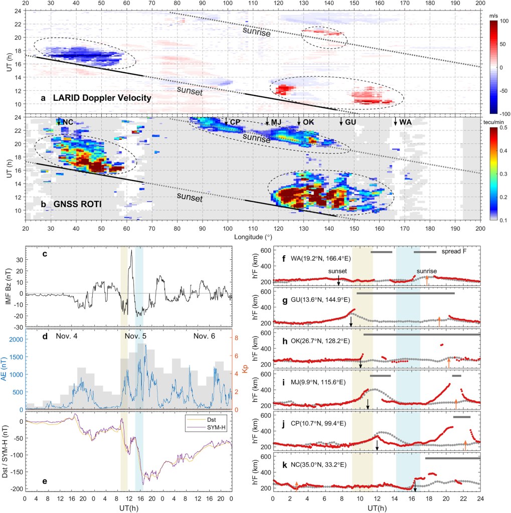 No artigo publicado na revista Geophysical Research Letters, é descrita a detecção simultânea de regiões de bolhas de plasma, após o pôr do sol e ao nascer do sol, observadas pelo radar durante uma tempestade geomagnética ocorrida de 4 a 6 de novembro de 2023.