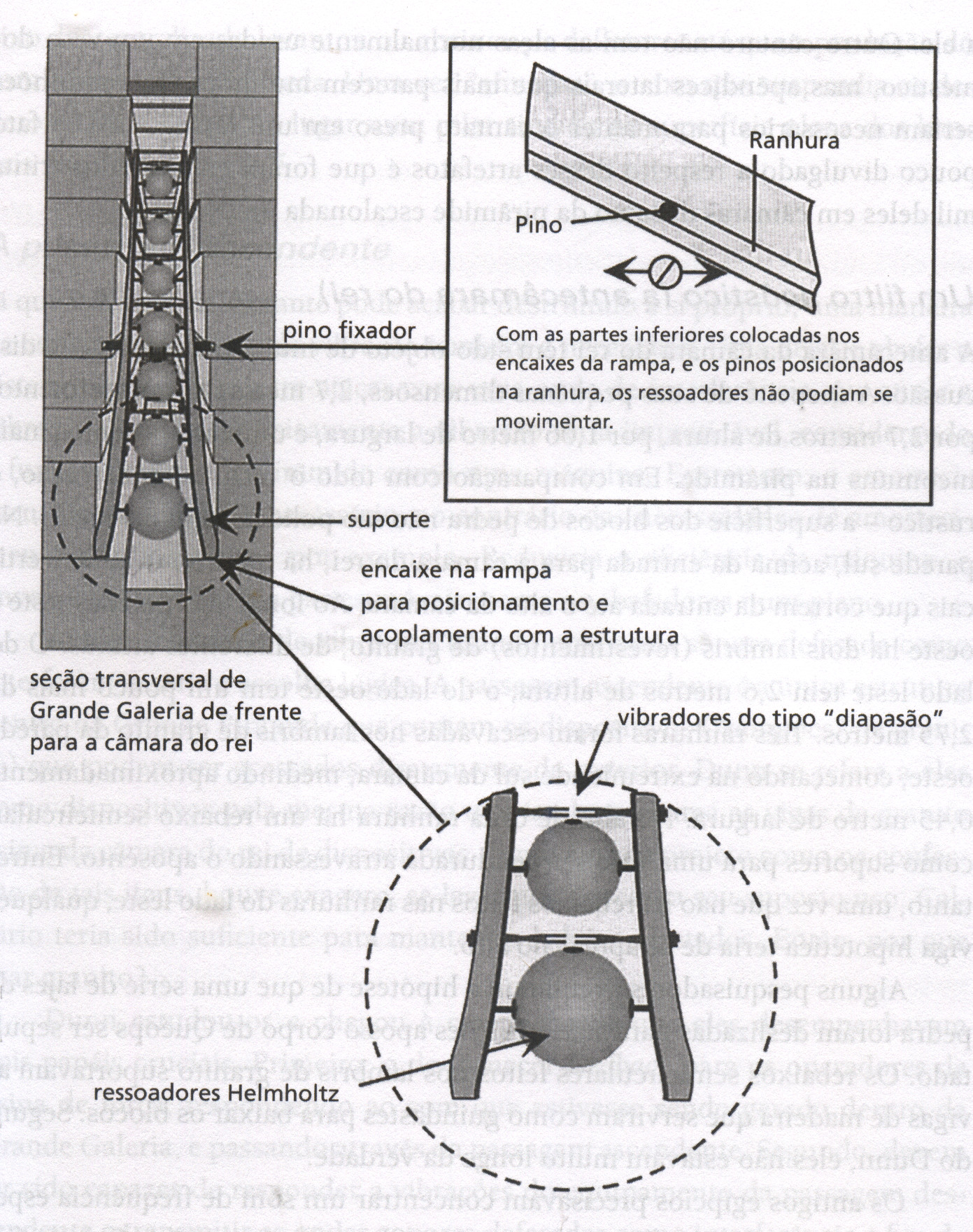 Embora seja necessária uma confirmação de um engenheiro acústico para corroborar que a Grande Galeria refletiria o som da maneira proposta, Dunn foi capaz de extrapolar outras informações acerca de dispositivos acústicos que já não estão mais no lugar. Ele teoriza que a Grande Galeria abrigava ressoadores que convertiam as vibrações conjugadas da Terra e da pirâmide em som propagado pelo ar. Os 27 pares de encaixes nas rampas laterais da galeria poderiam ter contido o conjunto de ressoadores. O que seria uma boa explicação para a existência dos encaixes, cuja existência sempre constituiu um mistério. Se a função deles era a de responder às vibrações da Terra, então, deveriam ser similares a um ressoador Helmholtz (veja fig. 6.3), um dispositivo atual que tem uma função similar.